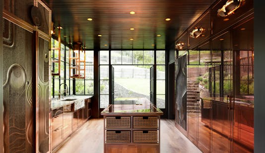 Edgy and industrial meet warm, rustic, and eclectic. Exposed brick walls against fresh, modern subway tiles build a wonderful balance. The open living plan is defined, softened, and scaled by a series of sculptural lighting in warm brass tones throughout. A strong mix of metals and woods range from rusted or rustic to glossy and modern. Furnishings bounce between old and new with custom upholstery centering around function and comfort. Layers of textural fabrics and wallcoverings lend a sense of cohesiveness, while pops of opposing artworks challenge the norm. Highlights include a wall-to-wall channeled headboard, DMc custom bench, coffee table, and rustic bar cabinet.